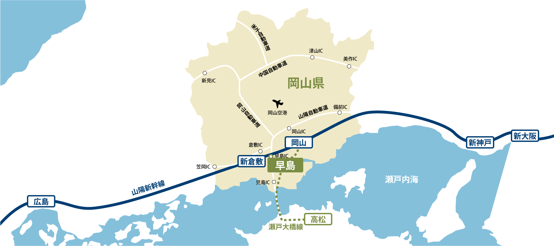 関西と山陽地方を東西で結び、山陰地方と四国を南北で結ぶ結節点に位置し、
